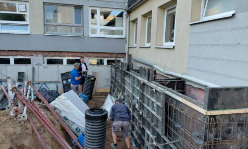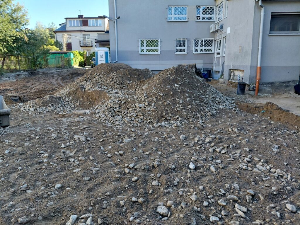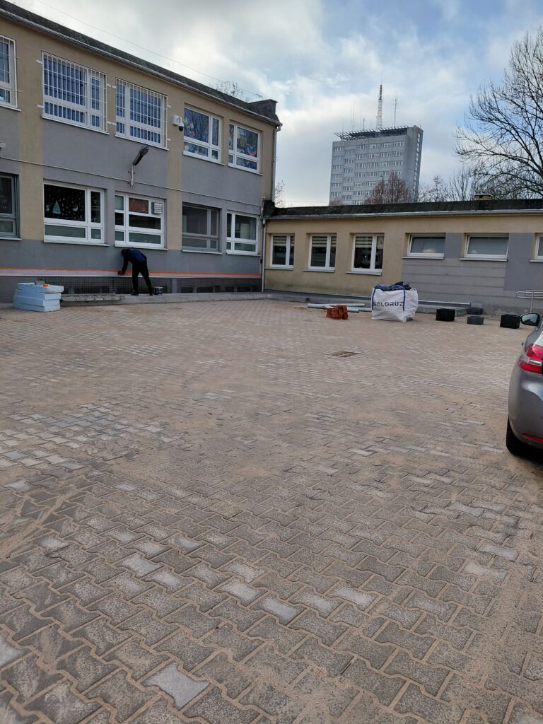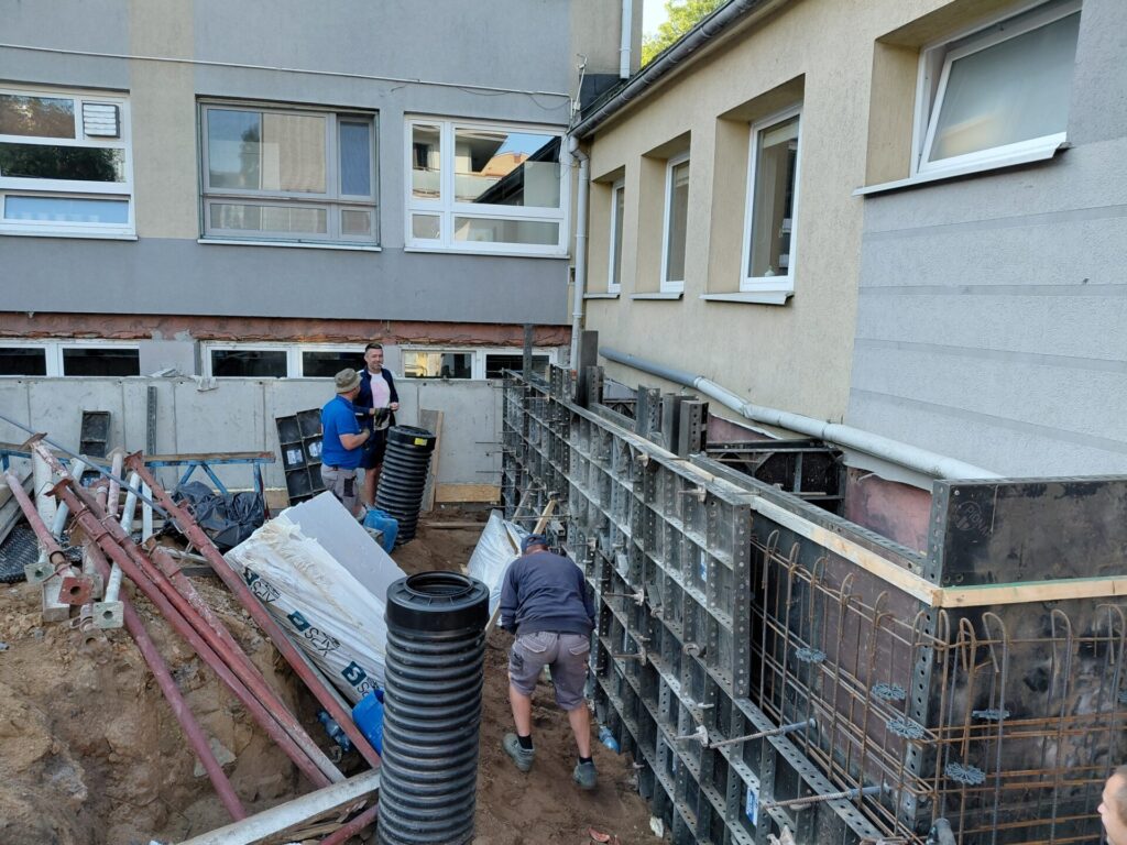 - Budowa zewnętrznej kanalizacji deszczowej – stworzenie nowoczesnego systemu odprowadzania wód opadowych, zapewniającego ochronę terenu placówki przed zalewaniem i nadmiernym zawilgoceniem.